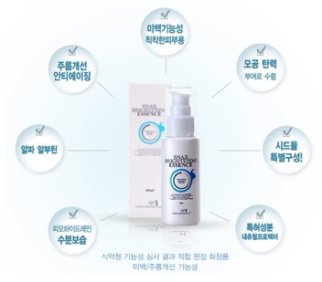 ‘동안 에센스’라고도 불리는 달팽이 브라이트닝 에센스는 미백, 주름개선, 모공탄력, 수분보습 등의 복합적인 기능으로 여성들 사이에서 입 소문이 난 대표적인 제품이다.
